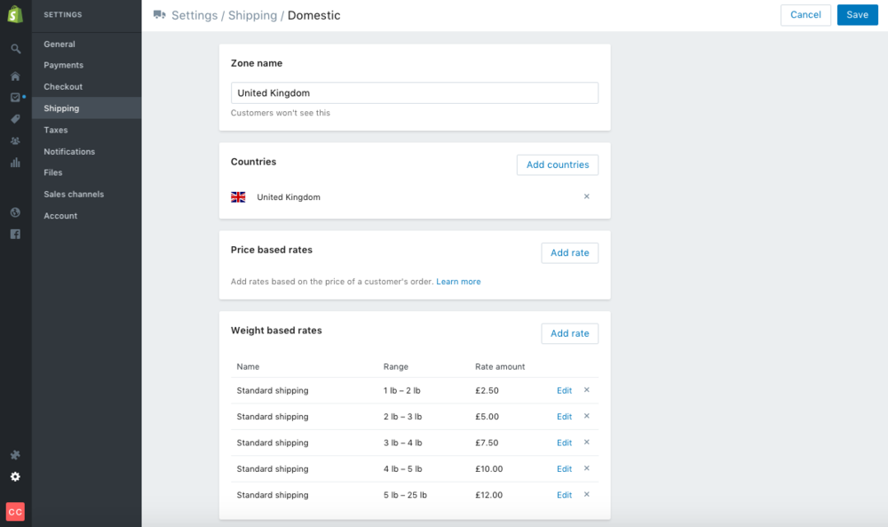If you’d rather go down the old-fashioned route, you can add shipping zones and rates to your store manually, from your Shopify dashboard. This allows you to apply shipping rates at the checkout, thus recovering the shipping costs directly from the customer.